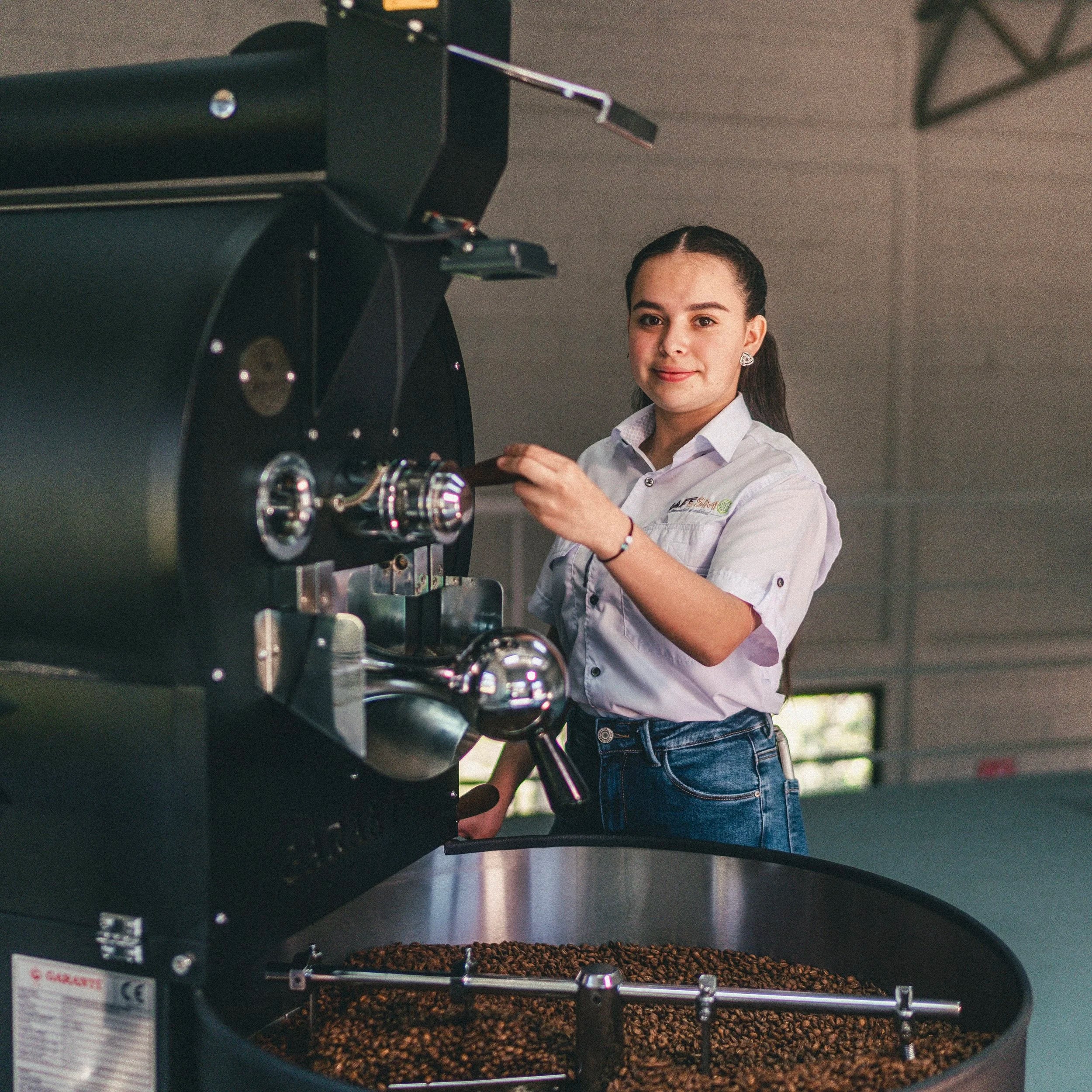 En cuanto Belkis cumplió 18 años, empezó a trabajar en Cafesmo, y ahora está a cargo de nuestra tostaduría, donde todos los miembros productores pueden tostar sus cafés, bajo la supervisión de Belkis. También ayuda a nuestra catadora Idalia en sus responsabilidades diarias, y aprende mucho en el proceso. Belkis se está convirtiendo rápidamente en una profesional del tueste y de la catación. Actualmente, le gustan más que todo los perfiles naturales, por su suave acidez y sus sabores pronunciados.