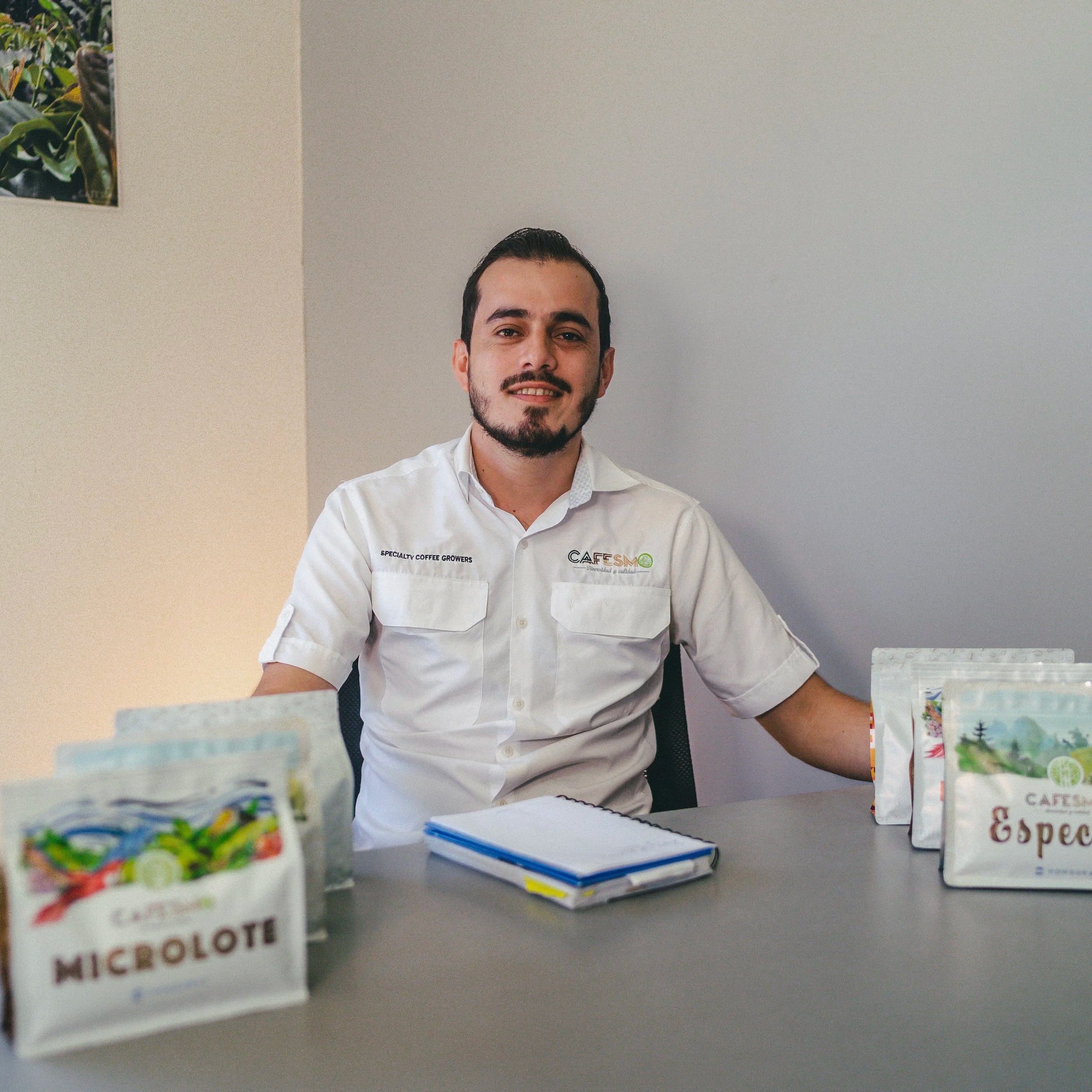 Es el administrador de Cafesmo, maneja todo lo financiero, también dirige la parte operativa de la empresa. Además, con su esposa, son productores de micro-lotes de excelente calidad y exportan café especial a varios países. Roy es un gran amante del café.
