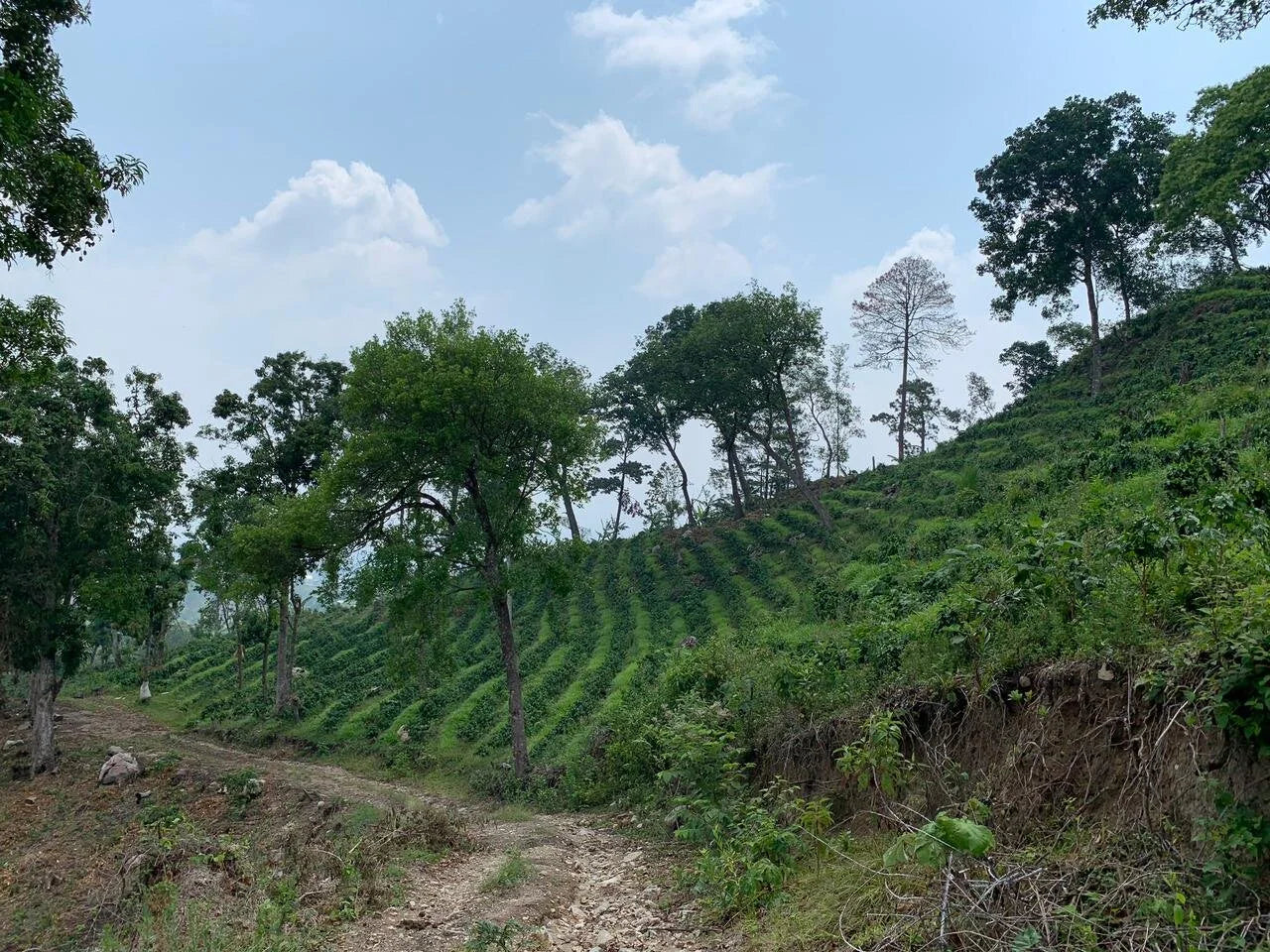 60% de sombra 40% de sol en la mayor parte del terreno, en algunas partes 50% - 50%. Mayormente de árboles locales, también plátanos y naranjos.
