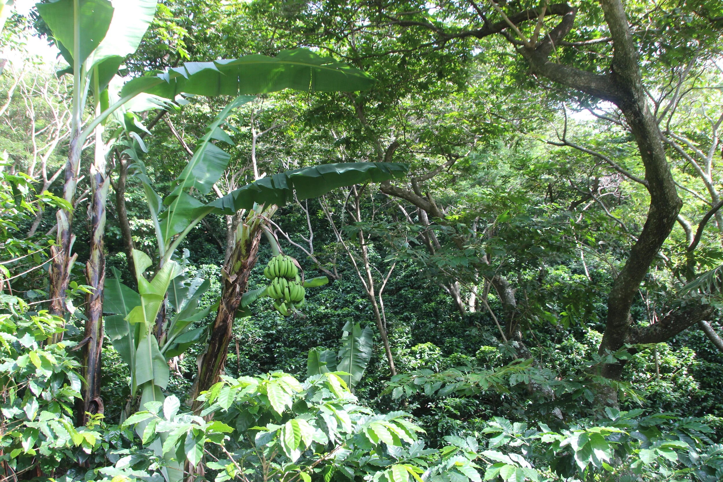 Hay algunos árboles de aguacate y plátano, pero la mayor parte de la sombra la proporcionan árboles locales como el guamo y el pepete.